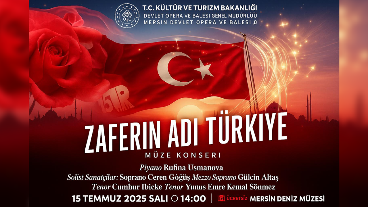 Spot: Mersin Devlet Opera ve Balesi (MDOB), 15 Temmuz 2025 Salı günü saat 14:00'te Mersin Deniz Müzesi'nde özel bir konserle sahne alacak. "Zaferin Adı Türkiye" başlıklı konserde Türk müziğinin sevilen eserleri seslendirilecek.
