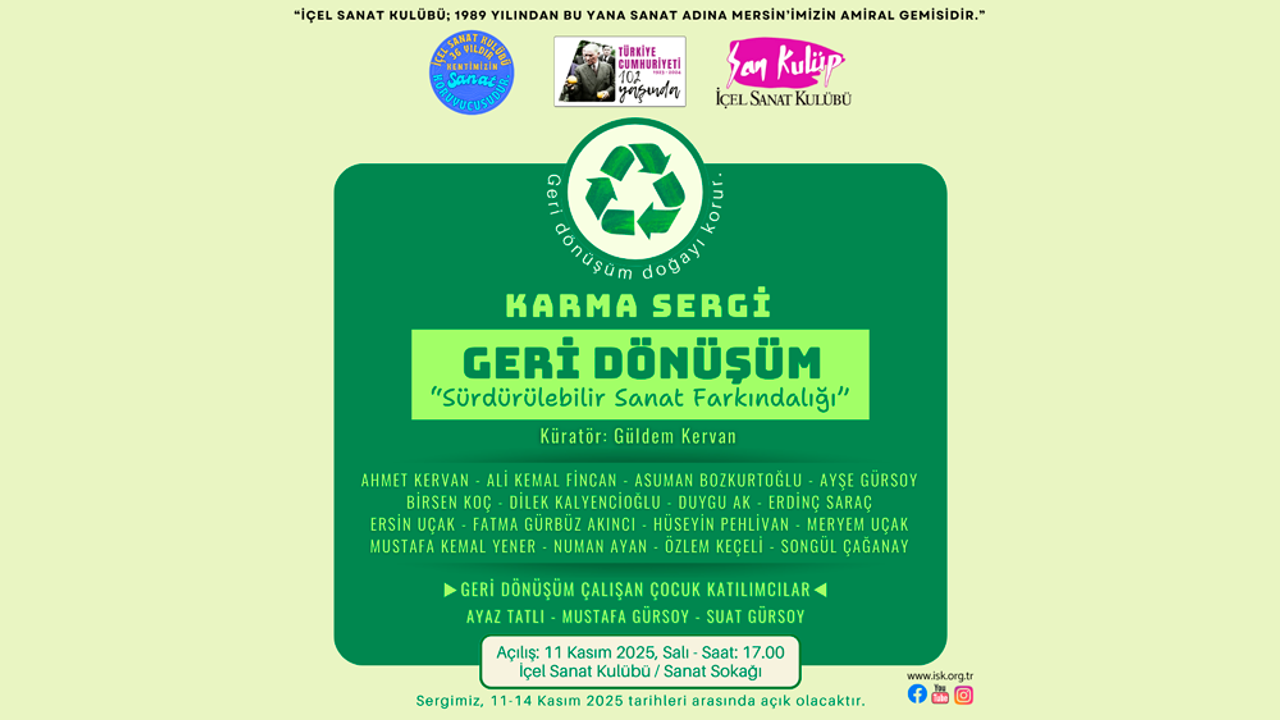 Mersin’in kültür ve sanat yaşamına 1989 yılından bu yana yön veren İçel Sanat Kulübü, Cumhuriyet’in 100. yılı coşkusunu çevre bilinciyle birleştiren anlamlı bir etkinliğe imza atıyor. “Geri Dönüşüm Karma Sergisi”, “Sürdürülebilir Sanat Farkındalığı” temasıyla sanatseverlerle buluşacak.