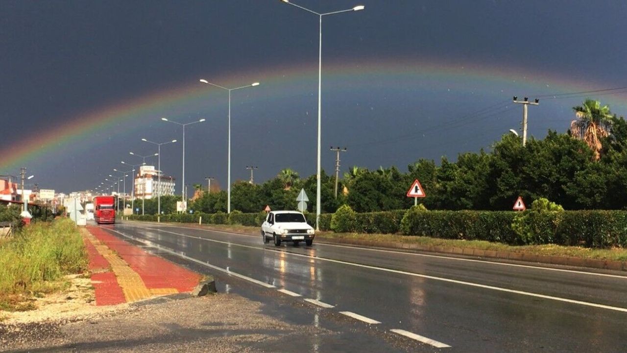 Meteorolojinin uyarıda bulunduğu Mersin’de, öğleden sonra şiddetli sağanak yağış etkili oldu. Erdemli ilçesi Kocahasanlı Mahallesi’nde ise yağmurun şiddetinin azaldığı bir anda bulutların arasından kendini gösteren güneş ışığı ile birlikte gökkuşağı oluştu. Mersin-Antalya D-400 karayolunda seyir halindeki araçların üzerinde oluşan gökkuşağı renkli ve bir o kadar da ilginç görüntü oluşturdu. Oluşan gökkuşağının üzerinde kısa bir süreliğine daha az belirgin ikinci bir gökkuşağı daha oluştu.