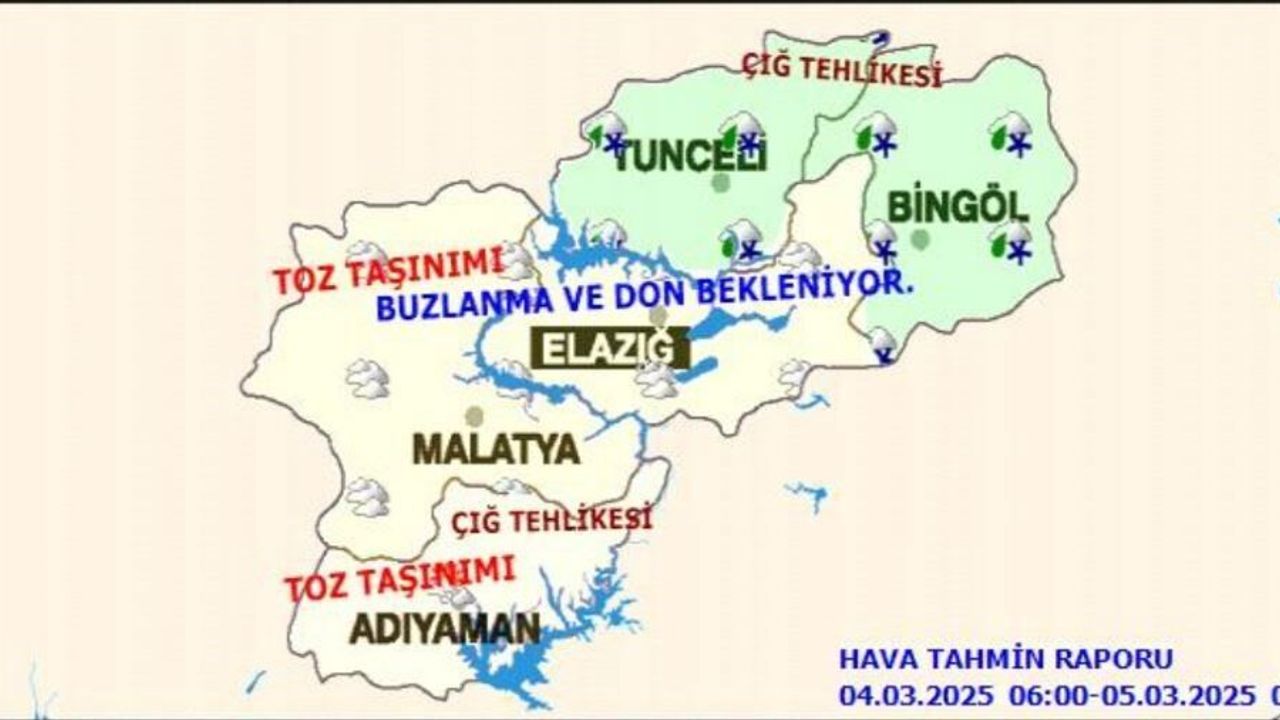 Meteoroloji 13. Bölge Müdürlüğü, Elazığ ve bölge için çığ, buzlanma, don ile toz taşınımı uyarısında bulundu.