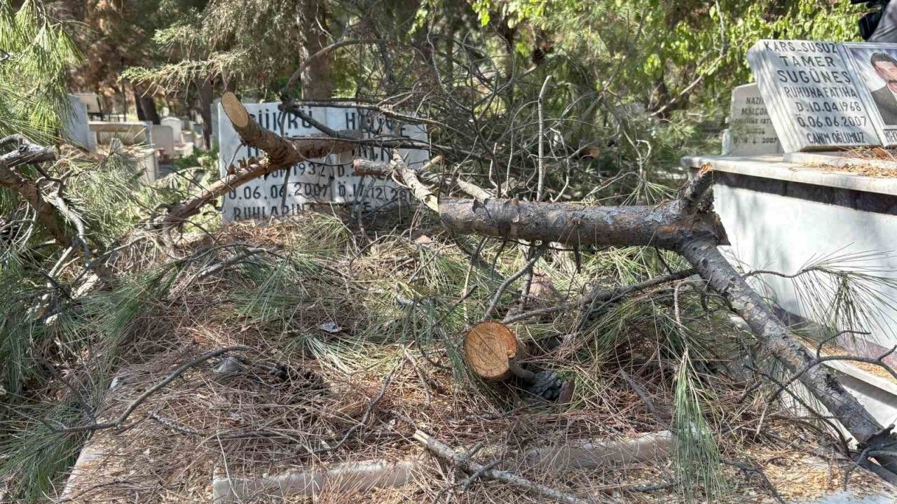 İzmir’in Buca ilçesindeki Kaynaklar Mezarlığı’nda yapılan ağaç budama çalışmaları sırasında, kontrolsüz bir şekilde kesilen dallar bazı mezarlara zarar verdi.