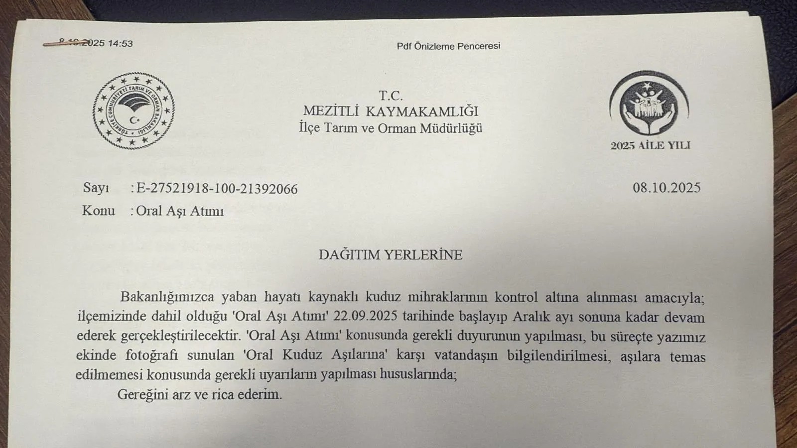 Mezitli Kaymakamlığı’nın 8 Ekim 2025 tarihli yazısında, Tarım ve Orman Bakanlığı’nın “yaban hayata kaynaklı kuduz mihraklarının kontrol altına alınması amacıyla” 22 Eylül 2025 tarihinde başlattığı ve Aralık ayı sonuna kadar süreceği belirtilen “Oral Aşı Atımı” uygulamasına dikkat çekildi.