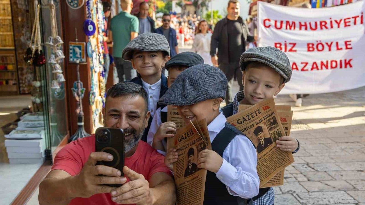 Manavgat Belediyesi Side Kreş ve Gündüz Bakımevi öğrencileri, 29 Ekim Cumhuriyet Bayramı etkinliği kapsamında hazırladıkları "Cumhuriyet ilan edildi" manşetli sembolik gazeteleriyle Antik Side sokaklarında vatandaşlara Cumhuriyet coşkusunu yaşattı.