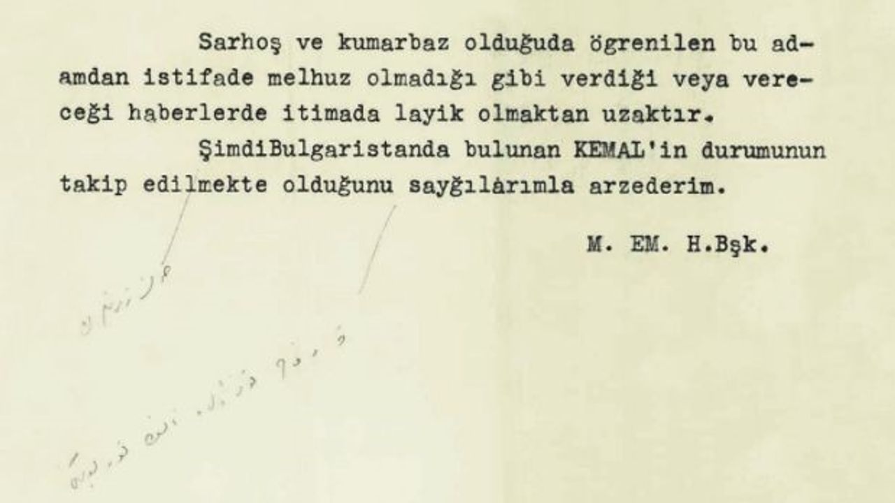 "Sarhoş ve kumarbaz olduğu da öğrenilen bu adamdan istifade melhuz olmadığı gibi verdiği veya vereceği haberlerde itimada layık olmaktan uzaktır. Şimdi Bulgaristan’da bulun Kemal’in durumunun takip edilmekte olduğunu saygılarımla arz ederim."