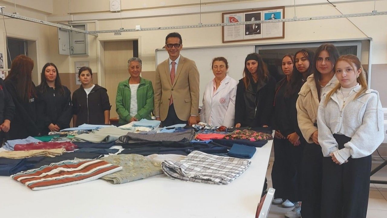 Okul müdürü Yıldıray Baş ve Moda Tasarım Öğretmeni Fatma Kaynak’a teslim edilen kumaşlar, öğrencilerin eğitimlerinde kullanılacak.