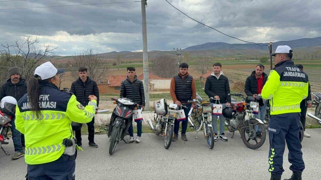 Afyonkarahisar’ın Bolvadin ilçesinde jandarma ekipleri tarafından ‘1 kural bir ömür’ projesi çerçevesinde motosiklet kullanıcılarına eğitim verilip, reflektör ve kask dağıtıldı.