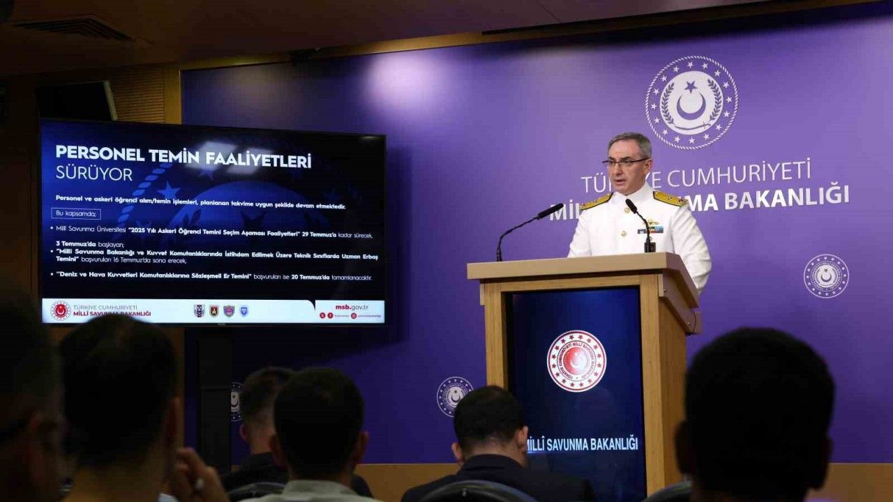 Personel ve askerî öğrenci alım/temin işlemlerinin planlandığı şekilde devam ettiğini belirte Tuğamiral Aktürk, "Millî Savunma Üniversitesi ‘2025 Yılı Askerî Öğrenci Temini Seçim Aşaması Faaliyetleri’ 29 Temmuz’a kadar sürecek, 3 Temmuz’da başlayan ‘Millî Savunma Bakanlığı ve Kuvvet Komutanlıklarında İstihdam Edilmek Üzere Teknik Sınıflarda Uzman Erbaş Temini’ başvuruları 16 Temmuz’da sona erecek, Deniz ve Hava Kuvvetleri Komutanlıklarına Sözleşmeli Er Temini" başvuruları ise 20 Temmuz’da tamamlanacaktır" şeklinde konuştu.