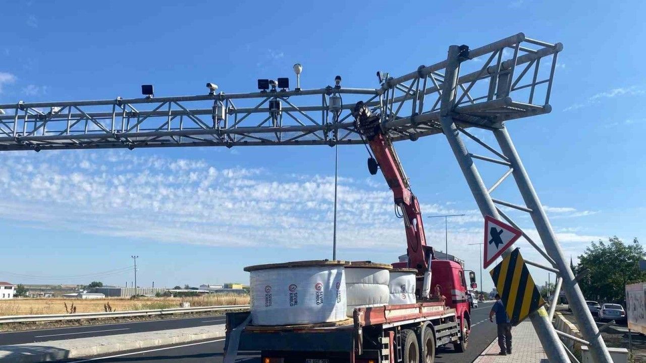 Tekirdağ’ın Muratlı ilçesinde bir vinç, Atatürk Caddesi üzerinde bulunan otoyol plaka tanıma sitemi direğine çarptı.