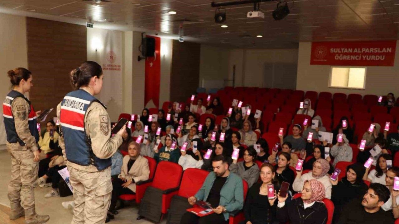 Muş’ta jandarma ekipleri, Sultan Alparslan Kız Öğrenci Yurdu’nda kalan 160 üniversite öğrencisine kadına yönelik şiddetle mücadele kapsamında KADES uygulaması hakkında bilgilendirme yaptı.
