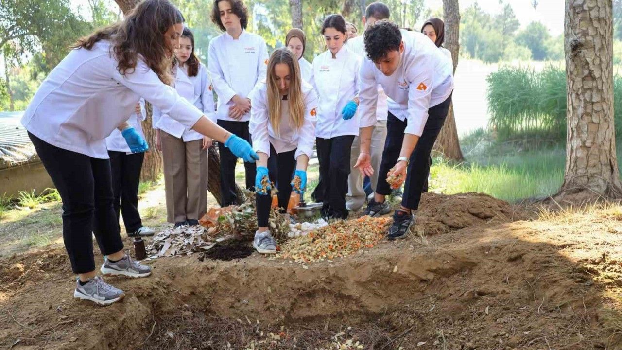 Dersin ve projenin yürütücüsü Eğitmen Şef Belgin Bulgan ise, öğrencilerin mutfak derslerinde kestikleri sebzelerden oluşan atıkları, kompost yapımına uygun şekilde biriktirdiklerini ifade ederek, "Asidik özellik taşımadığı için daha çok patates ve havuç gibi sebzelerle çalıştık. Öğrenciler, atıkları toprağa karıştırmadan önce daha kolay çözünmesi için küçülttü. Patates ve havucun yanı sıra karbon-nitrojen dengesini sağlamak için hafta boyunca biriktirilen kahve telveleri, ağartılmamış kağıt ve kuru yaprak; toprağı mineral açısından zenginleştirmek için de yumurta kabukları kullandık. Bir haftalık biriktirme sürecinin ardından tüm bu malzemeleri dengeli şekilde toprağa gömdük. Atıklar, zamanla toprakta çözülmeye başlayacak. Besin değeri açısından zengin, bitki ve meyve yetiştirmeye elverişli doğal bir gübre elde edeceğiz. Bu tür sürdürülebilir uygulamalar, geleceğimizi korumak için doğaya da büyük katkı sunacaktır" ifadelerini kullandı.