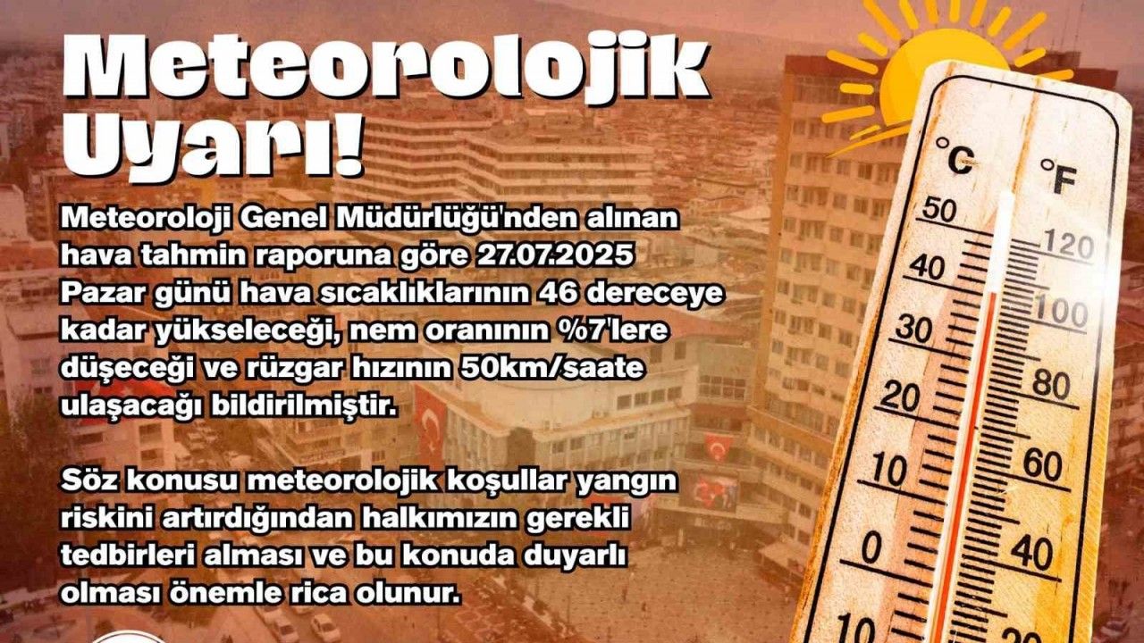 Nazilli Belediyesi tarafından yapılan paylaşımda, "Meteoroloji Genel Müdürlüğü’nden alınan hava tahmin raporuna göre 27 Temmuz 2025 Pazar günü hava sıcaklıklarının 46 dereceye kadar yükseleceği, nem oranının yüzde 7’lere düşeceği ve rüzgar hızının 50km/saate ulaşacağı bildirilmiştir. Söz konusu meteorolojik şartlar yangın riskini artırdığından halkımızın gerekli tedbirleri alması ve bu konuda duyarlı olması önemle rica olunur" ifadelerine yer verildi.