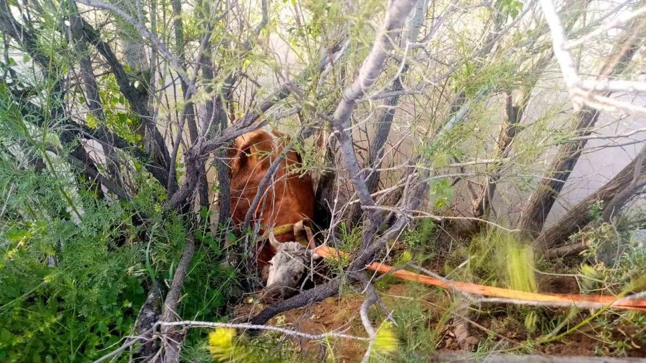 Erzincan’da nehir kıyısına düşen inek, itfaiye ekibince kurtarıldı.