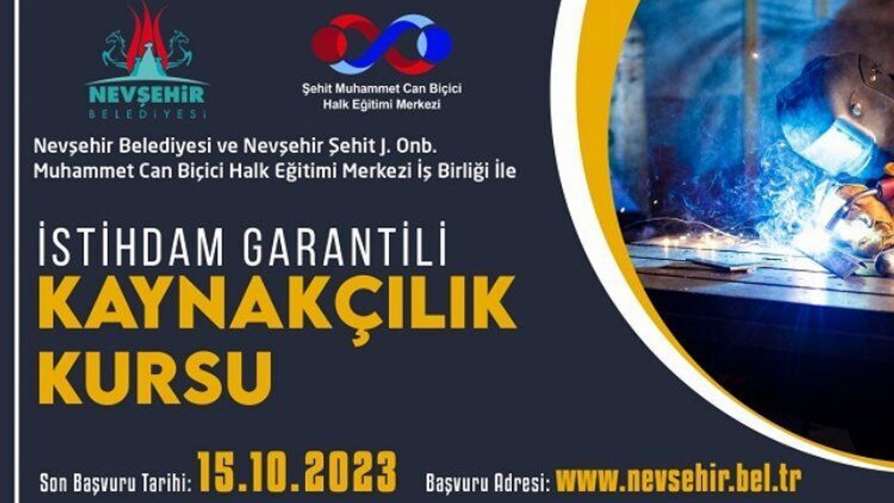 Nevşehir Belediyesi ve Nevşehir Şehit J. Onb. Muhammet Can Biçici Halk Eğitimi Merkezi işbirliğinde istihdam garantili Kaynakçılık Kursu açılacak. Kursa katılmak isteyenler başvurularını 15 Ekim 2023 tarihine kadar www.nevsehir.bel.tr adresi üzerinden online olarak yapabilecek.