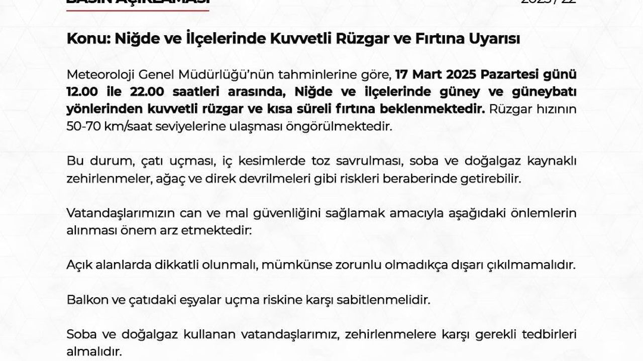 Niğde Valiliği, 17 Mart 2025 Pazartesi günü Niğde ve ilçelerinde kuvvetli rüzgar ve kısa süreli fırtına beklendiğini duyurdu.