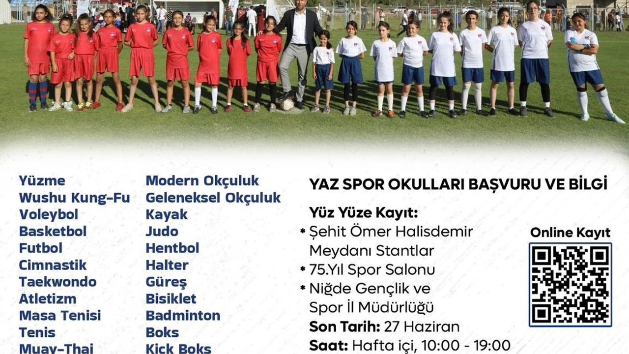 Niğde Belediyesi ile Gençlik ve Spor İl Müdürlüğü iş birliğinde düzenlenen ve geleneksel hale gelen yaz spor okulları, bu yıl da ’Ulusal Spor Projeleri: Sporla Yaşa!’ sloganıyla start alıyor. Gençlerin yaz tatilini verimli, sağlıklı ve eğlenceli bir şekilde geçirmesini amaçlayan proje kapsamında, 25 farklı branşta ücretsiz spor eğitimi verilecek.