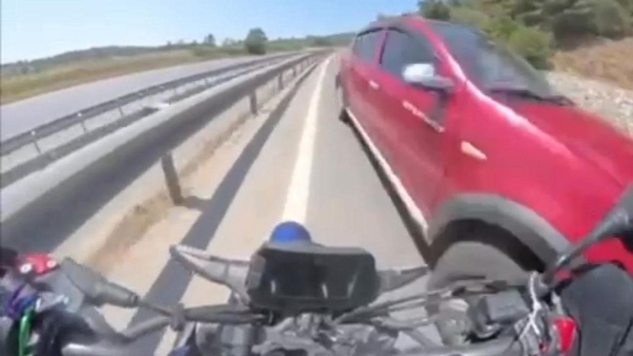 Bursa İstanbul karayolunda sol şeritte hızla ilerleyen motosikletli, ters yönden gelen otomobili son anda fark etti. Facianın teğet geçtiği o anlar kask kamerasına anbean yansıdı.