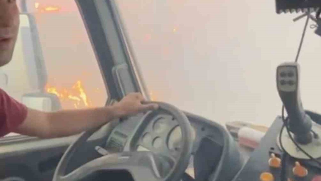 Çanakkale’nin Ezine ilçesinde çıkan orman yangınına Orman Bölge Müdürlüğü ekipleri havadan ve karadan müdahale ediyor. Bu sırada alevlerin arasında kalan bir arazözdeki orman işçileri, o zor anları cep telefonu kameralarıyla kaydetti.