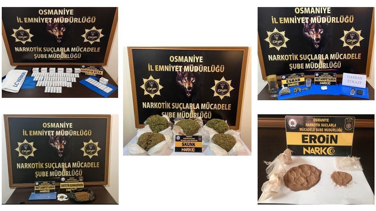 Narkotik Suçlarla Mücadele Şube Müdürlüğü, İstihbarat Şube Müdürlüğü, Kadirli ve Düziçi İlçe Emniyet Müdürlüğü ekiplerince, 25 Eylül- 1 Ekim tarihleri arasında uyuşturucu satıcılarına yönelik 16 ayrı operasyon düzenlendi. Yapılan aramalarda 8,05 kilogram skunk, 358 adet sentetik ecza, 539,3 gram bonzai, 40,59 gram esrar, 28,49 gram eroin, 7,19 gram metamfetamin, 1 adet hasas terazi, 2 bin 760 Türk Lirası para geçirildi.