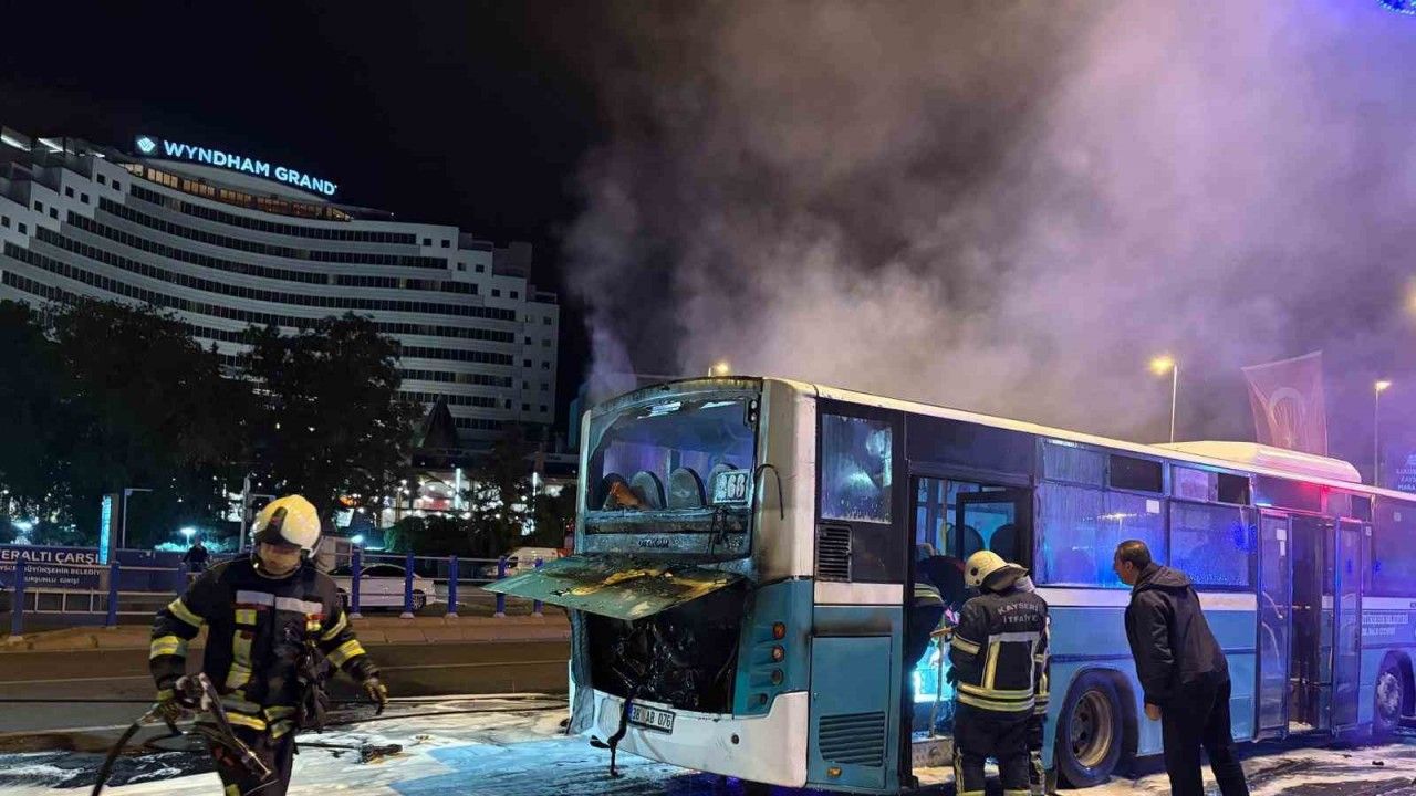 Kayseri’nin Melikgazi ilçesinde özel halk otobüsü kırmızı ışıkta beklediği sırada motor kısmından alev alırken, polis ekiplerinin müdahalesi yangının büyümesini engelledi.