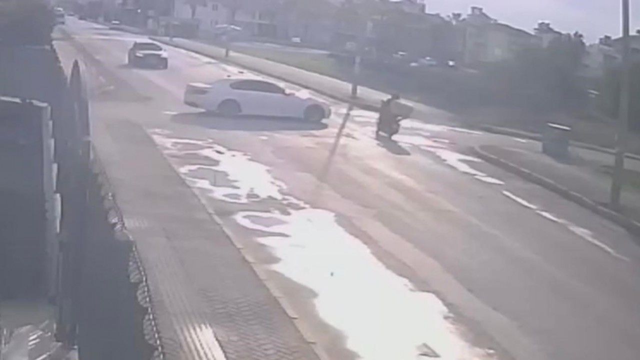 Kaza anı güvenlik kamerası tarafından anbean kaydedilirken görüntülerde, ana yolda seyir halinde olan motosikletli kuryenin tali yoldan çıkan otomobil ile çarpışma anı ve motosiklet sürücüsünün yola savrulup sürüklendiği anlar yer aldı.