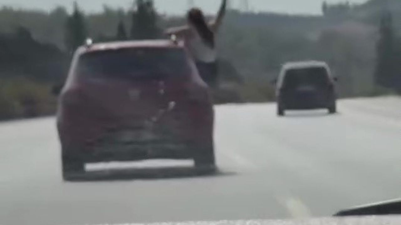 Olay, TAG otoyolunda yaşandı. Alınan bilgiye göre, otoyolda seyrede cipte yolcu olarak bulunan bir kadın cama çıkıp aracın kapısına oturdu. Ellerini de açarak bir süre böyle yolculuk yapan kadın yürekleri ağza getirdi. O anlar başka bir sürücü tarafından cep telefonu ile kaydedildi.