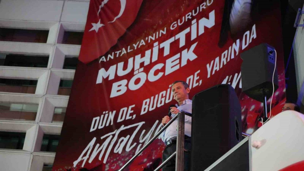 CHP Genel Başkanı Özgür Özel’in konuşmasından önce tutuklu Antalya Büyükşehir Belediye Başkanı Muhittin Böcek’in miting alanına gönderdiği mektup okundu. Böcek, mektubunda şu ifadelere yer verdi: "Sizlere 8 m’lik hücremden sesleniyorum. Bu hücrenin bir duvarında sizlerin yüzlerini görüyor, sizleri duyuyorum; bir duvarında bir Türk bayrağının kim ne yaparsa yapsın şanla şerefle dalgalandığını görüyorum; bir duvarında benimle birlikte yol yürüyen belediyedeki ekip arkadaşlarımı görüyorum. Dört duvarın son duvarında ise hiçbir şartta vazgeçmemeyi, yılmamayı, yorulmamayı öğrendiğim mavi gözlü devin gözlerini görüyorum. Bu duvarlar bizleri tutsak etmiş gibi gözükse de meydanlarda yüz binler, milyonlar olmamızı sağladı; bunu da biliyorum. Ben Torosların, şu dağların, hemen yanı başınızdaki köylerinde doğmuş, büyümüş bir Yörük çocuğuyum. Vatan diye ektiğim toprakta, cumhuriyet sayesinde, milletin oylarıyla uzun yıllardır Antalya’da belediye başkanlığı yapıyorum. Çok zorlu dönemler gördüm. Acıları, sıkıntıları, hatta sizlerin dualarıyla sağ çıktığım COVID dönemini yaşadım. Ama ben bugüne kadar hukukun ve vicdanların bu derece keyfi hale geldiğini ilk kez görüyorum. Bizler belediye başkanlarıyız; hesap vermenin bir vazife, bir sorumluluk olduğunu biliriz. Çok şükür ne Antalya’ma ne de vatanıma veremeyeceğim hiçbir hesabım yok. Ben tüm partilerin oyuyla, desteğiyle seçilmiş; altı kez mazbata almış olduğum için buradayım, bunu biliyorum."