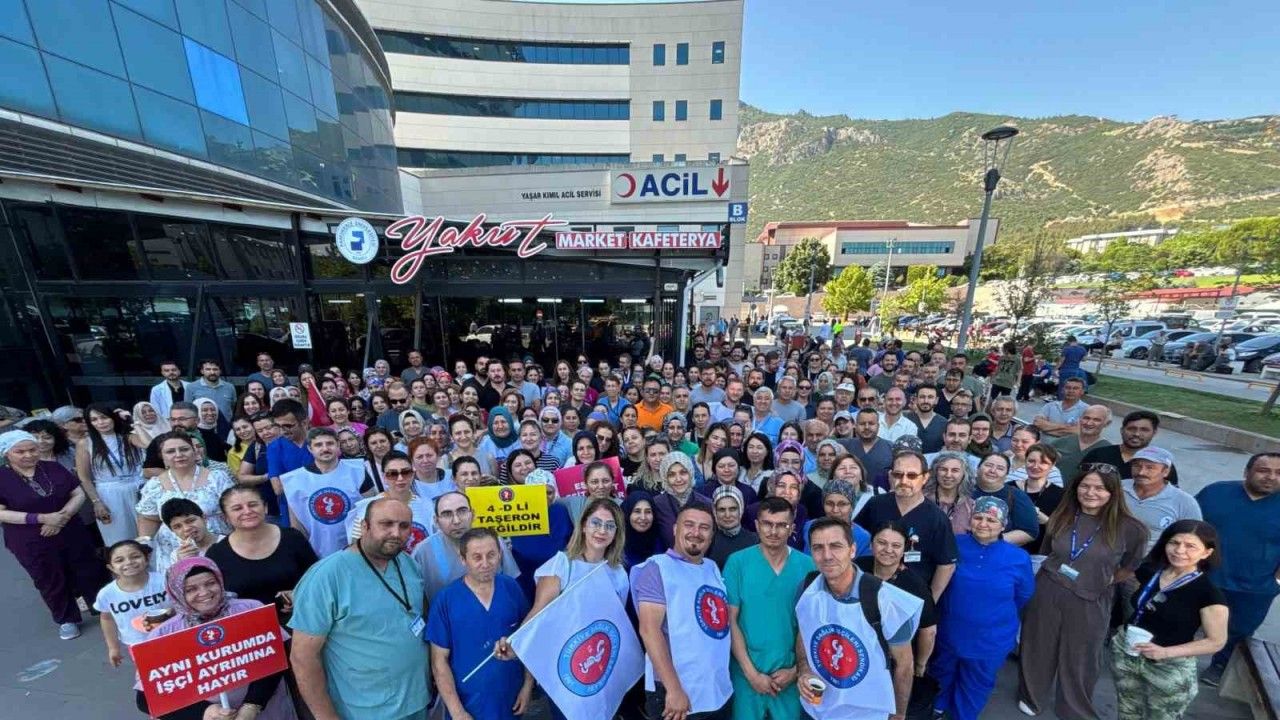 Denizli Pamukkale Üniversitesi (PAÜ) Hastanesinde görevli bir grup sağlık çalışanı, eşit çalışma şartları ve eşit ücret talebiyle 2 saatliğine 2’inci kez iş bırakma eylemi gerçekleştirdi.