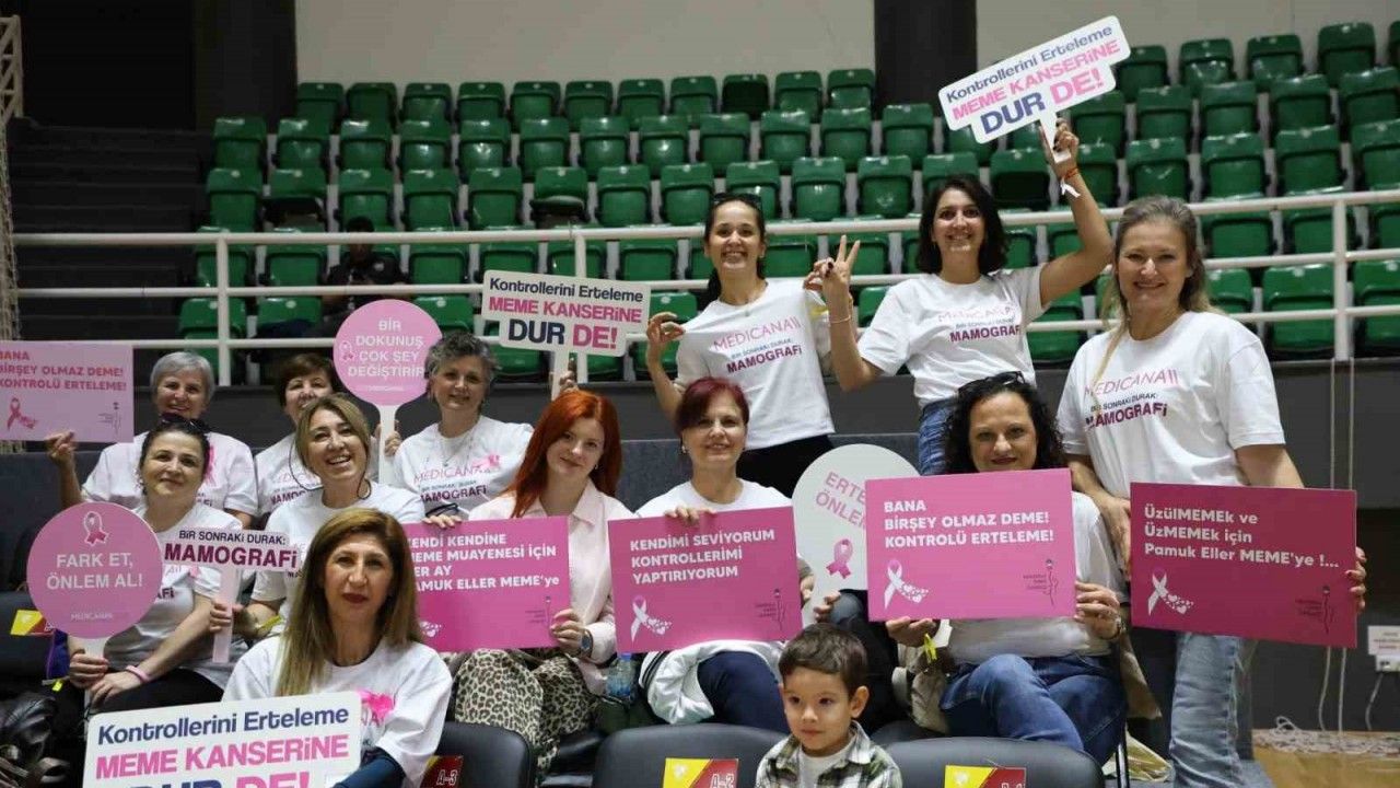 Meme Kanseri Farkındalık Ayı dolayısıyla kentin dört bir yanında "Bir sonraki durak: Mamografi" kampanyasıyla farkındalık oluşturan Medicana International İzmir Hastanesi, bu kez kampanyayı parkeye taşıdı. İzmir’in simgelerinden Tarihi Bergama Vapuru’nda başlayan kampanya, deniz ulaşımıyla devam etmişti. Söz konusu kampanya, bu kez Medicana’nın sağlık sponsoru olduğu Göztepe’nin katkılarıyla parkede yankı buldu. Karşılaşmayı izlemeye gelen kadınlara meme kanseri farkındalığının simgesi pembe kurdeleleri dağıtan Göztepe Basketbol Takımı, parkeye ellerinde "Mamografini yaptır, kontrollerini ihmal etme" yazılı pankartla çıkarak farkındalık mesajı verdi. Farkındalık çalışmasına, Darüşşafaka Lassa sporcuları da destek verdi. Pankartın açıldığı sırada spiker, "Meme kanserinde erken teşhise giden yol, kendi kendine elle muayene, düzenli doktor kontrolü ve mamografiden geçer. Erken teşhis tedavide başarı şansını artırır. Mamografini yaptır, kontrollerini ihmal etme" dedi. Led ekranlardaki mesajlarla da kadın sporseverlere meme kanseriyle mücadelede erken teşhisin önemi hatırlatıldı. Kanserle Dans Derneği üyeleri de kendilerine ayrılan courtside alanında hem takıma destek oldu hem de farkındalık mesajlarının yer aldığı dövizlerle meme kanserine dikkat çekti. Parkedeki farkındalık çalışması, sporseverlerin destek alkışlarıyla sona erdi.