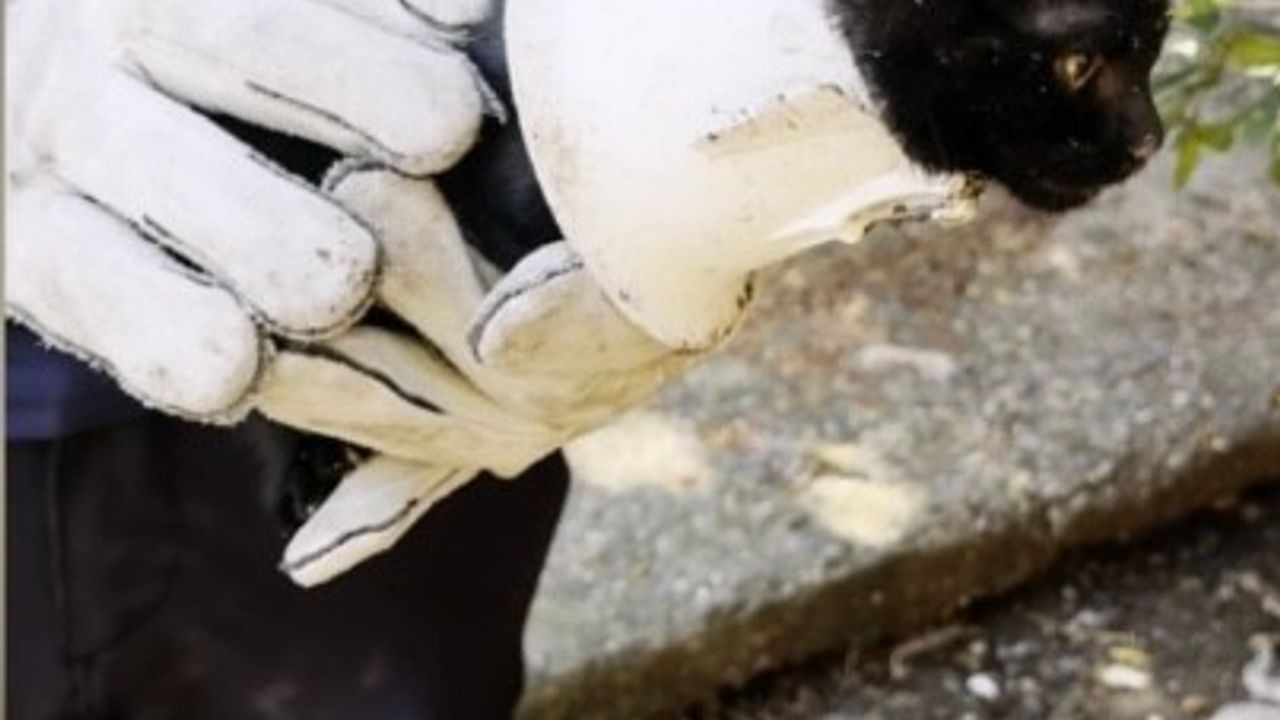 Osmaniye’de plastik kapağa sıkışan yavru kedi, itfaiye ekiplerince kurtarıldı.