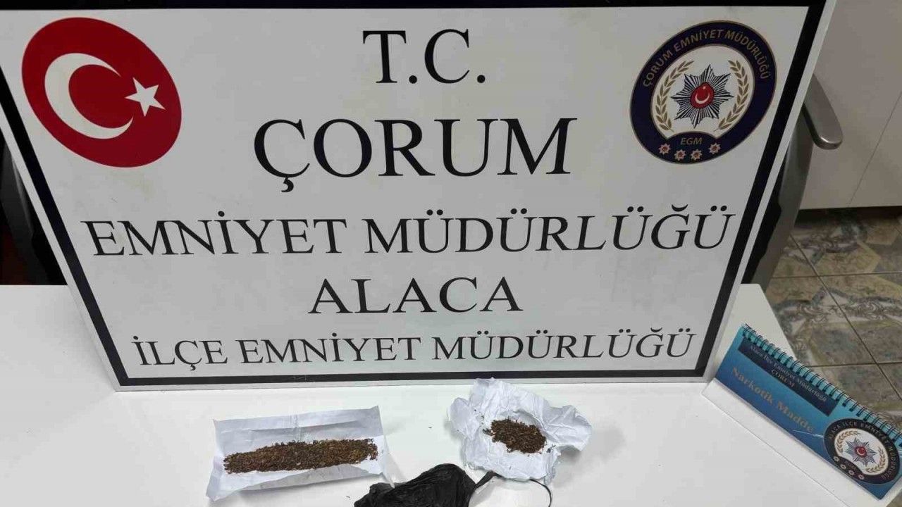 Edinilen bilgiye göre, Alaca İlçe Emniyet Müdürlüğü ekipleri, Çorum Caddesi üzerinde şüphe üzerine bir otomobili durdurmak istedi. Polis ekiplerinin "dur" ihtarında bulunduğu sırada, araçta bulunan şahısların camdan dışarıya bazı maddeler attığı fark edildi. Aracı durduran ekipler, şahısları etkisiz hale getirirken, şahısların 3 paket halinde toplam 14 gram uyuşturucu maddeyi camdan dışarı attığı tespit edildi. Uyuşturucu maddelere el konulurken, araçta bulunan A.T., G.B., B.Ç. ve O.D. gözaltına alındı.