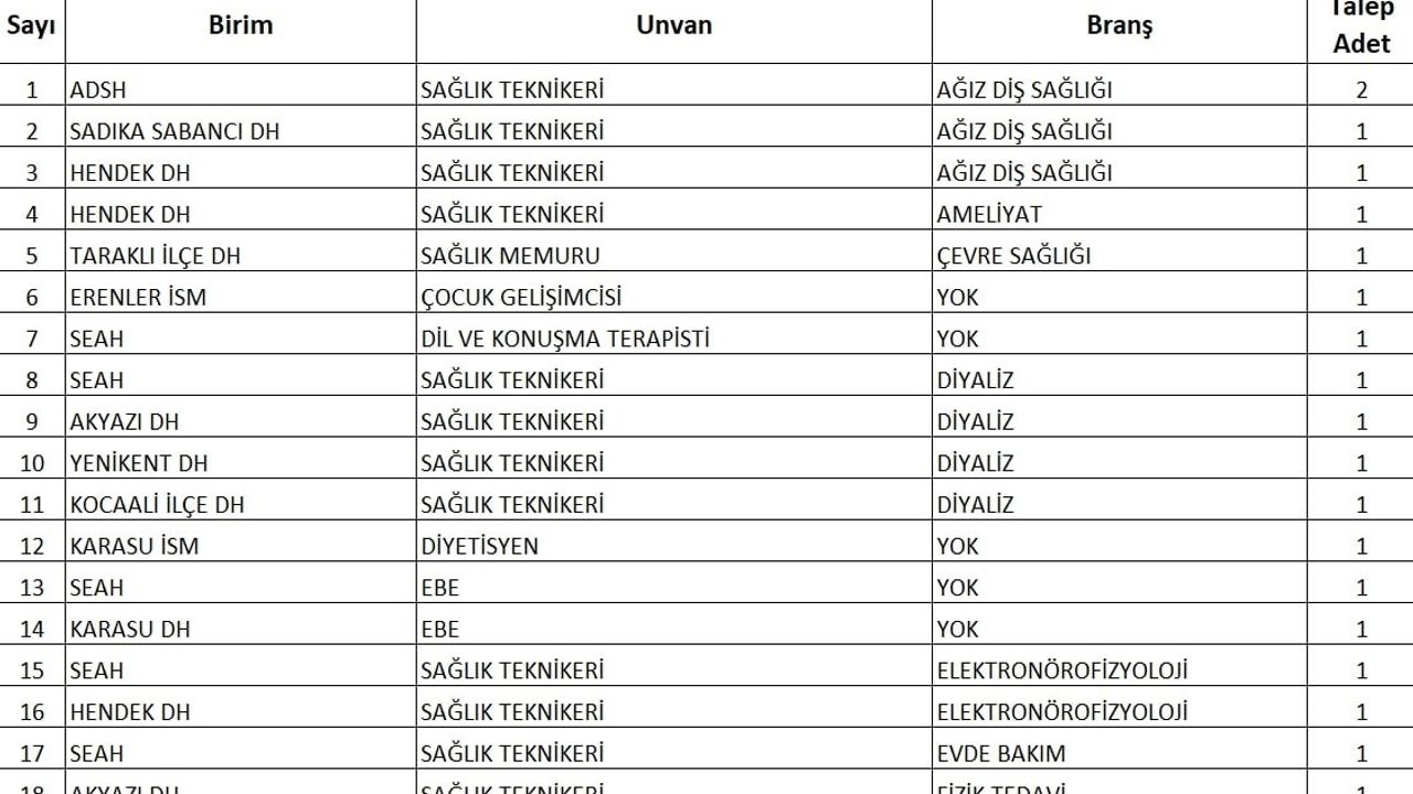 Sağlık Bakanlığı, merkez ve taşra teşkilatında görevlendirilmek üzere 15 bin 342 sözleşmeli personel ve 3 bin 658 işçi alımı gerçekleştirecek. Sağlık Bakanı Prof. Dr. Kemal Memişoğlu sosyal medya üzerinden yaptığı, "KPSS sonuçlarına göre ÖSYM tarafından yapılacak merkezi yerleştirme ile toplam 15 bin 342 personel alımı gerçekleştirilecektir" açıklama ile personel alımını gerçekleştirileceğini duyurdu. Bu çerçevede Sağlık Bakanlığı personel alımı branş dağılımı yayımlanan kılavuz ile birlikte belli oldu. Sakarya’da 215 personelin alınacağı branşlar arasında sağlık teknikeri, sağlık memuru, çocuk gelişimcisi, dil ve konuşma terapisti, diyetisyen, ebe, fizyoterapist, hemşire, sağlık fizikçisi, temizlik hizmetleri, bakım onarım teknik destek kadroları yer aldı. Sakarya’ya atanacak olan 215 personel; Sakarya İl Sağlık Müdürlüğü, Sakarya Eğitim ve Araştırma Hastanesi, Yenikent Devlet Hastanesi, Sadıka Sabancı Devlet Hastanesi, Ağız ve Diş Sağlığı Hastanesi, Hendek Devlet Hastanesi, Taraklı İlçe Devlet Hastanesi, Kocaali İlçe Devlet Hastanesi, Karasu Devlet Hastanesi, Pamukova Devlet Hastanesi, Akyazı Devlet Hastanesi, Kaynarca İlçe Devlet Hastanesi. Ferizli İlçe Devlet Hastanesi, Sapanca İlçe Devlet Hastanesi, Halk Sağlığı Laboratuvarı ve sağlık ocaklarında görev yapacak.