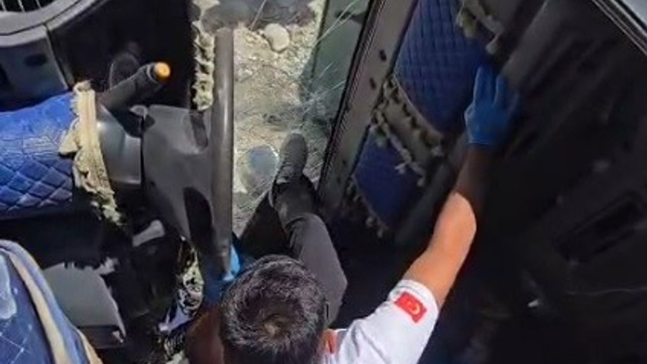 Şanlıurfa’da sağlık görevlileri, devrilen kamyonun camını kırarak yaralı sürücüyü çıkarttı.