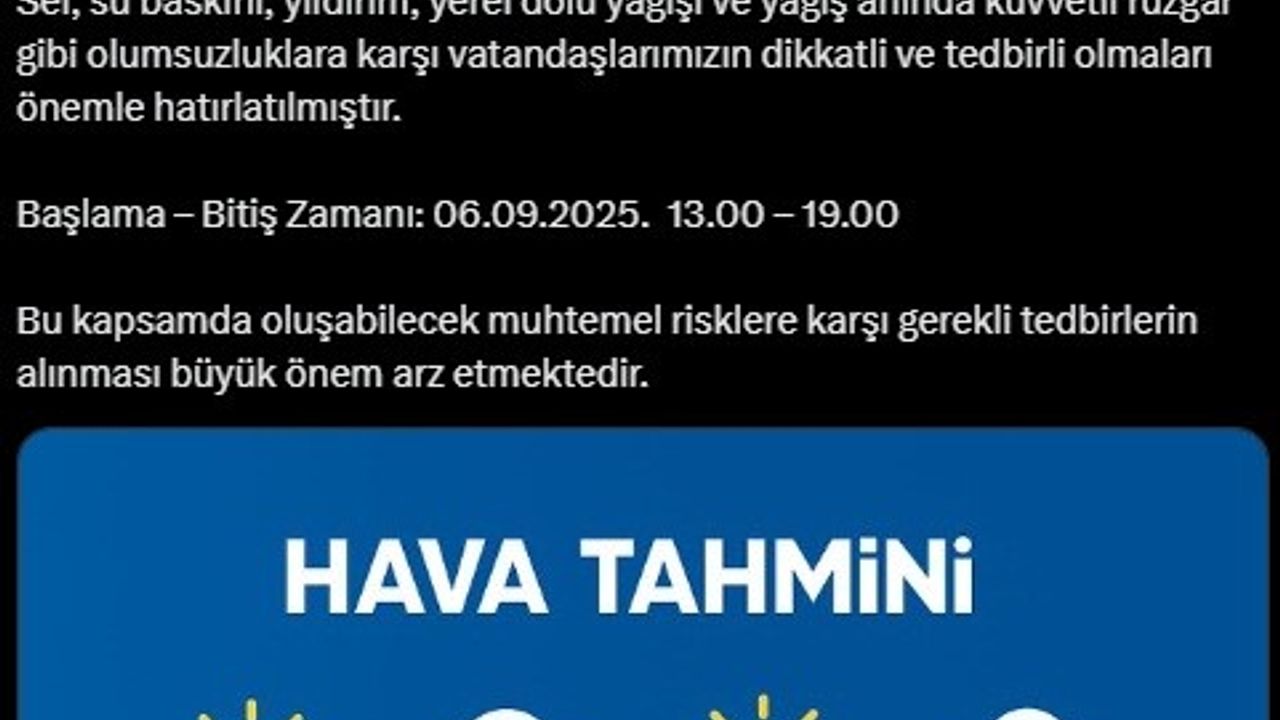 Yapılan açıklamada, 6 Eylül Cumartesi günü 13.00 ile 19.00 saatleri arasında il genelinde gök gürültülü sağanak yağışların beklendiği belirtildi. Sel, su baskını, yıldırım, yerel dolu ve yağış anında kuvvetli rüzgar gibi olumsuzluklara karşı dikkatli olunması istendi. Valiliğin sosyal medya hesabından yapılan paylaşımda, "Meteoroloji Genel Müdürlüğü’nün son değerlendirmelerine göre; yarın (Cumartesi) yurdun kuzeybatı kesimlerinde görülecek gök gürültülü sağanak yağışların, öğle saatlerinden itibaren Sakarya çevrelerinde etkili olması beklenmektedir. Sel, su baskını, yıldırım, yerel dolu yağışı ve yağış anında kuvvetli rüzgar gibi olumsuzluklara karşı vatandaşlarımızın dikkatli ve tedbirli olmaları önemle hatırlatılmıştır. Bu çerçevede oluşabilecek muhtemel risklere karşı gerekli tedbirlerin alınması büyük önem arz etmektedir" ifadeleri yer aldı.