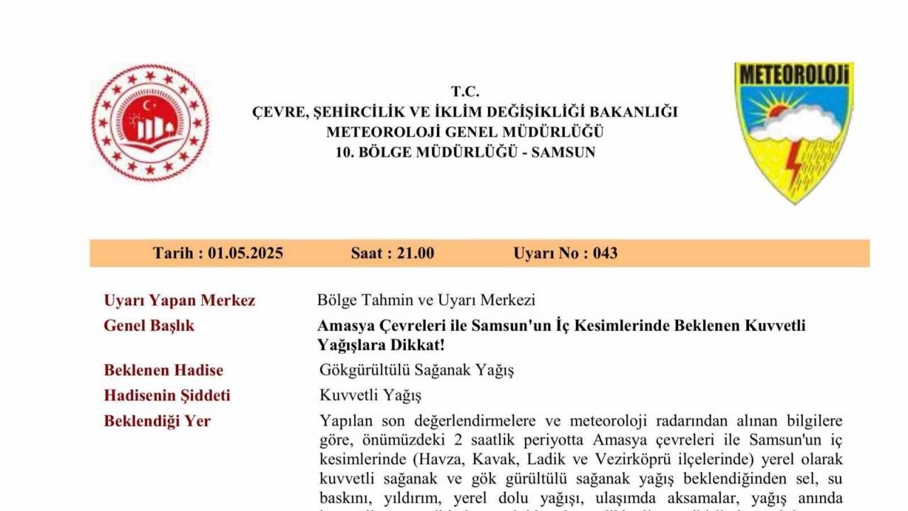 "Yapılan son değerlendirmelere ve meteoroloji radarından alınan bilgilere göre, önümüzdeki 2 saatlik periyotta Amasya çevreleri ile Samsun’un iç kesimlerinde (Havza, Kavak, Ladik ve Vezirköprü ilçelerinde) yerel olarak kuvvetli sağanak ve gök gürültülü sağanak yağış beklendiğinden sel, su baskını, yıldırım, yerel dolu yağışı, ulaşımda aksamalar, yağış anında kuvvetli rüzgar gibi olumsuzluklara karşı dikkatli ve tedbirli olunmalıdır."