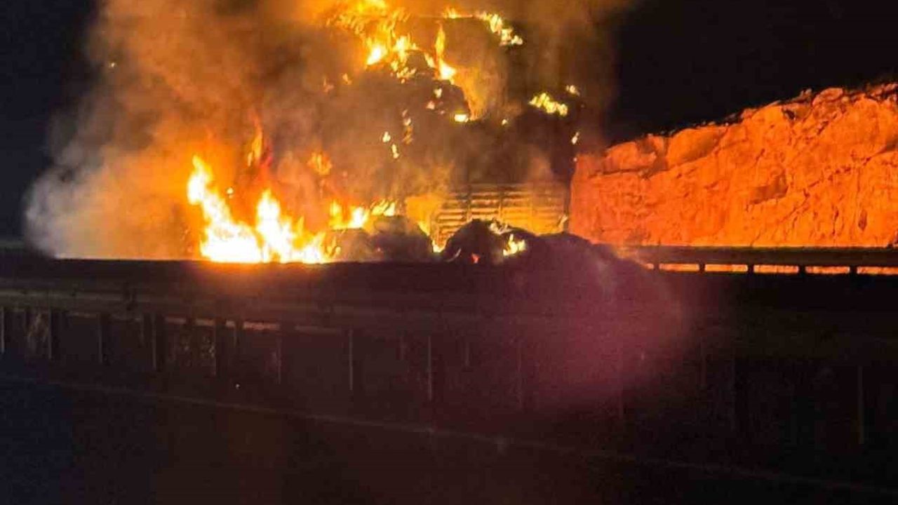 Şanlıurfa’da alev alan saman yüklü tır kullanılamaz hale geldi.