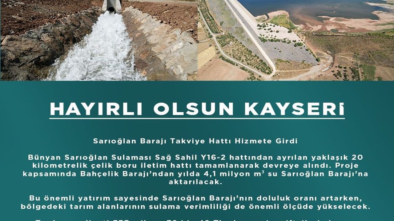 Sarıoğlan Barajı Takviye Hattı hizmete girdi. Proje çerçevesinde Bahçelik Barajı’ndan yılda 4,1 milyon metreküp su Sarıoğlan Barajı’na aktarılacak. AK Parti Kayseri İl Başkanı Hüseyin Okandan, Sarıoğlan Barajı Takviye Hattı’nın hizmete girmesiyle ilgili olarak sosyal medya hesabından bir mesaj yayınladı.