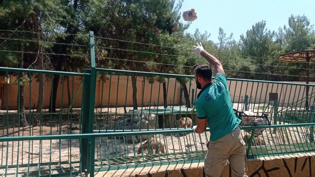 Gaziantep’te Doğal Yaşam Parkı’nda bulunan bozayılara, aslan ve kaplanlara sıcak yaz günlerinde serinlemeleri için meyve ve sebzeler ile dondurulmuş etten oluşan buzlu kokteyli veriliyor.