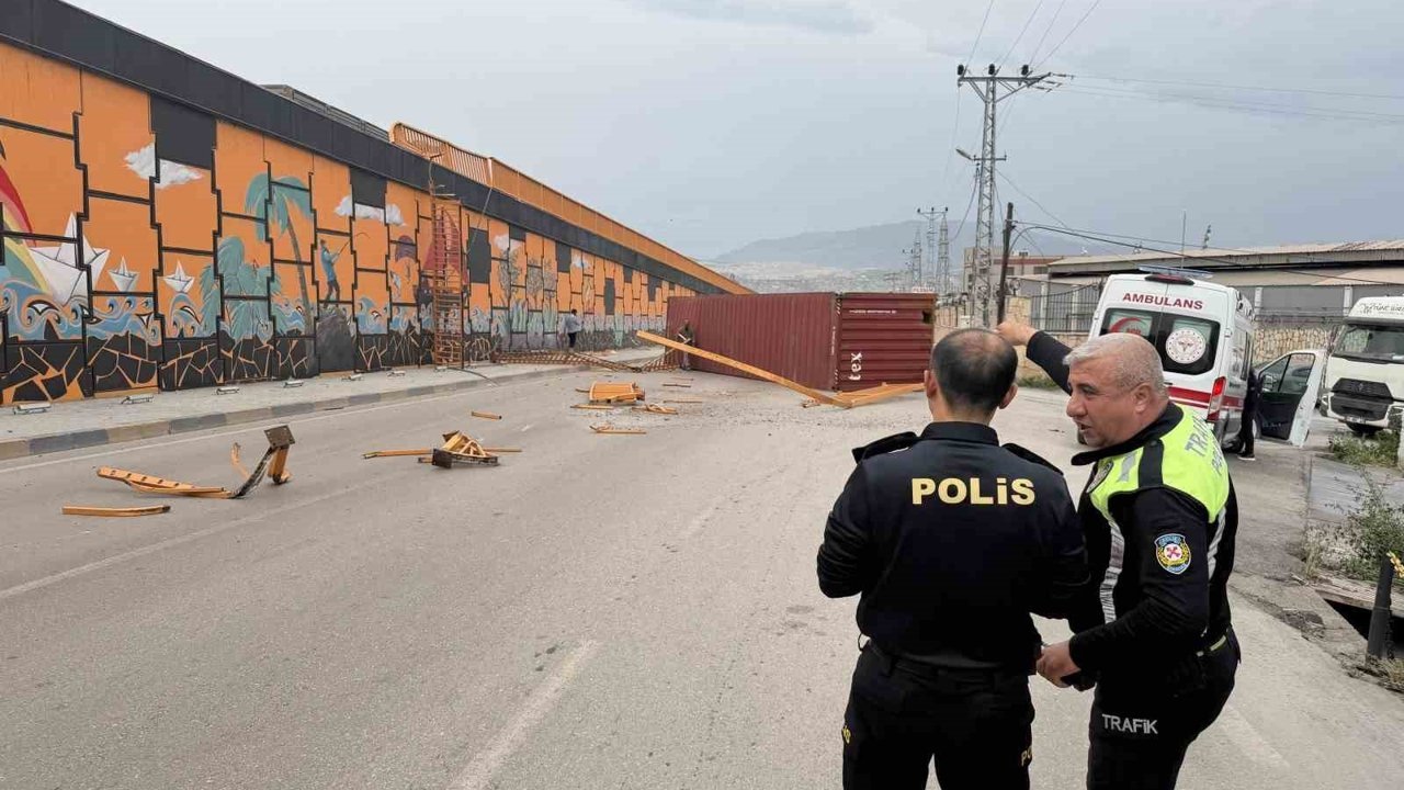 Olay; İskenderun - Payas yolu Akçay bölgesinde yaşandı. Seyir halinde ilerleyen tırın üzerinde bulunan konteyner, kuvvetli fırtınayla uçtu. Tırdan uçan konteyner, köprüden aşağı düştü ve yolu trafiğe kapattı. İhbar üzerine bölgede polis ekipleri tarafından güvenlik önlemi alındı. İskenderun İlçe Emniyet Müdürü Nevzat Güneş'de bölgeye giderek olay yerinde koordinasyonu sağladı. Öte yandan konteynerin tır üzerinden uçtuğu anlarsa seyir halindeki bir aracın kamerasına yansıdı. Konteynerin kaldırılmasıyla yol araç trafiğine yeniden açıldı.
