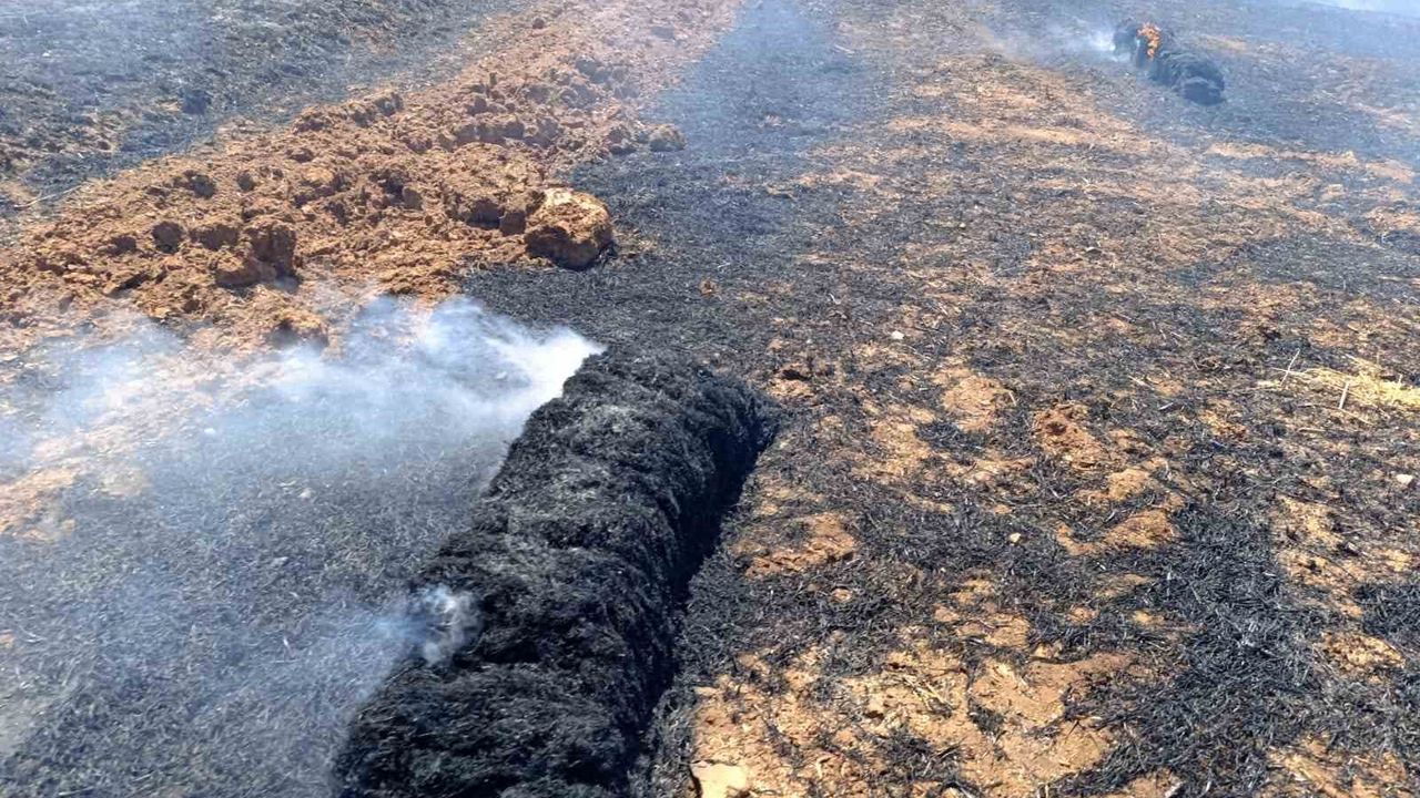 Balıkesir’in Sındırgı ilçesinde tarladan biçilen ve balyalanmak için bekleyen samanlar çıkan yangında kül oldu.