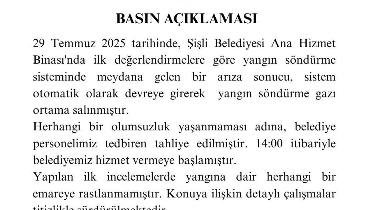 Şişli Belediyesi tarafından çıkan yangın ile ilgili açıklama yapıldı. Yapılan açıklamada, "29 Temmuz tarihinde, Şişli Belediyesi Ana Hizmet Binası’nda ilk değerlendirmelere göre yangın söndürme sisteminde meydana gelen bir arıza sonucu, sistem otomatik olarak devreye girerek yangın söndürme gazı ortama salınmıştır. Herhangi bir olumsuzluk yaşanmaması adına, belediye personelimiz tedbiren tahliye edilmiştir. Saat 14.00 itibariyle belediyemiz hizmet vermeye başlamıştır. Yapılan ilk incelemelerde yangına dair herhangi bir emareye rastlanmamıştır. Konuya ilişkin detaylı çalışmalar titizlikle sürdürülmektedir" denildi.
