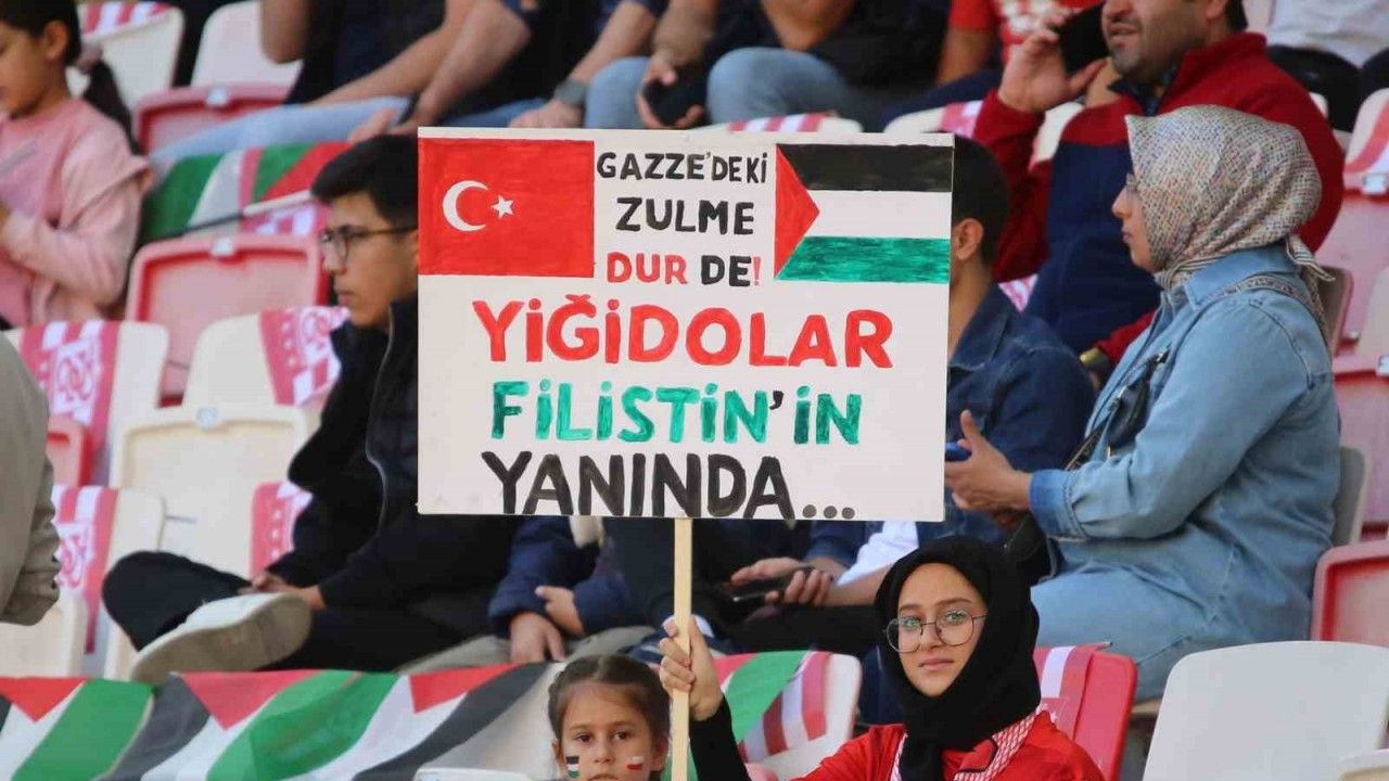 Tribünlerde kırmızı-beyazlı renklerin yanı sıra Filistin bayrakları da dalgalandı. Taraftarlar, ’Gazze’deki soykırıma sessiz kalma’ ve ’Meşale Sivas’ta yandı, ışığı Gazze’ye ulaşacak’ sloganlarıyla Filistin’e destek mesajı verdi.