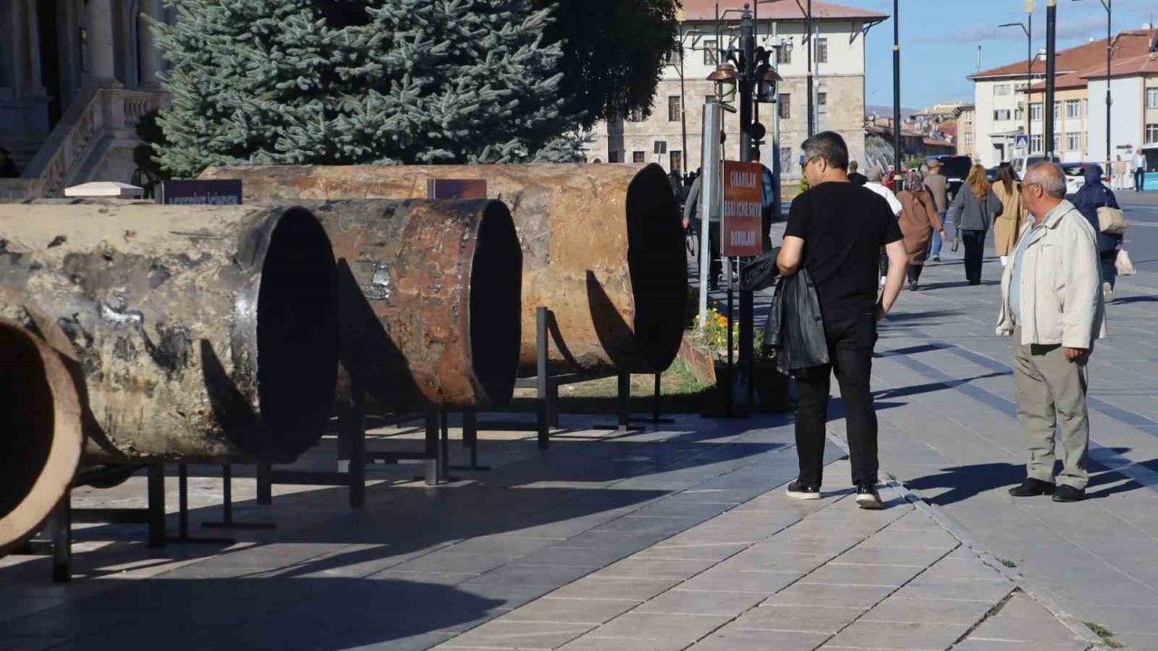 Sivas Belediyesi tarafından gerçekleştirilen altyapı çalışmalarında çıkarılan borular kent meydanında sergileniyor.