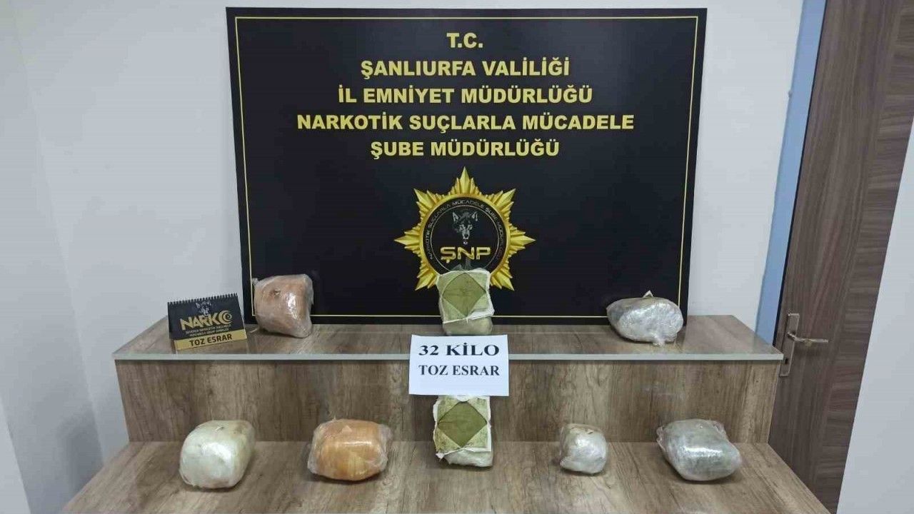 Edinilen bilgiye göre, Şanlıurfa İl Emniyet Müdürlüğü Narkotik Suçlarla Mücadele Şube Müdürlüğü ekipleri, şüphelendikleri bir tırı durdurdu. Tırın dorse kısmında arama yapan ekipler, 13 parça halinde paketlenmiş 32 kilogram toz esrar maddesi ele geçirdi. Gözaltına alınan 1 şahıs emniyete götürülürken, yaklaşık 160 bin vatandaşın tacirler tarafından zehirlenmesinin önüne geçildiği belirtildi.