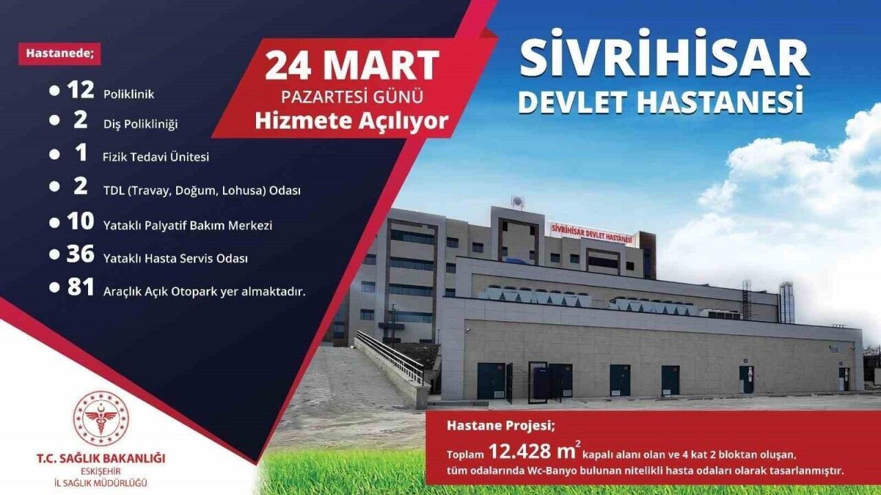 Eskişehir İl Sağlık Müdürü Doç. Dr. Yaşar Bildirici, Sivrihisar Devlet Hastanesi’nin 24 Mart 2025 tarihinde hizmete sunulacağını açıkladı.
