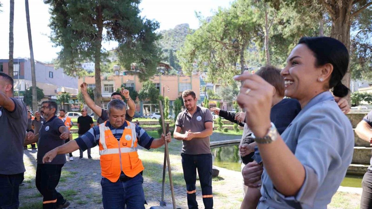 Başkan Atlı, temizlik biriminden sorumlu Başkan Yardımcısı Alev Ataş ile birlikte belediye çalışanlarının neşesine ortak olurken davul zurna eşliğinde süpürgeleriyle dans eden işçilerin mutluluğu, izleyenlerin yüzüne yansıdı.