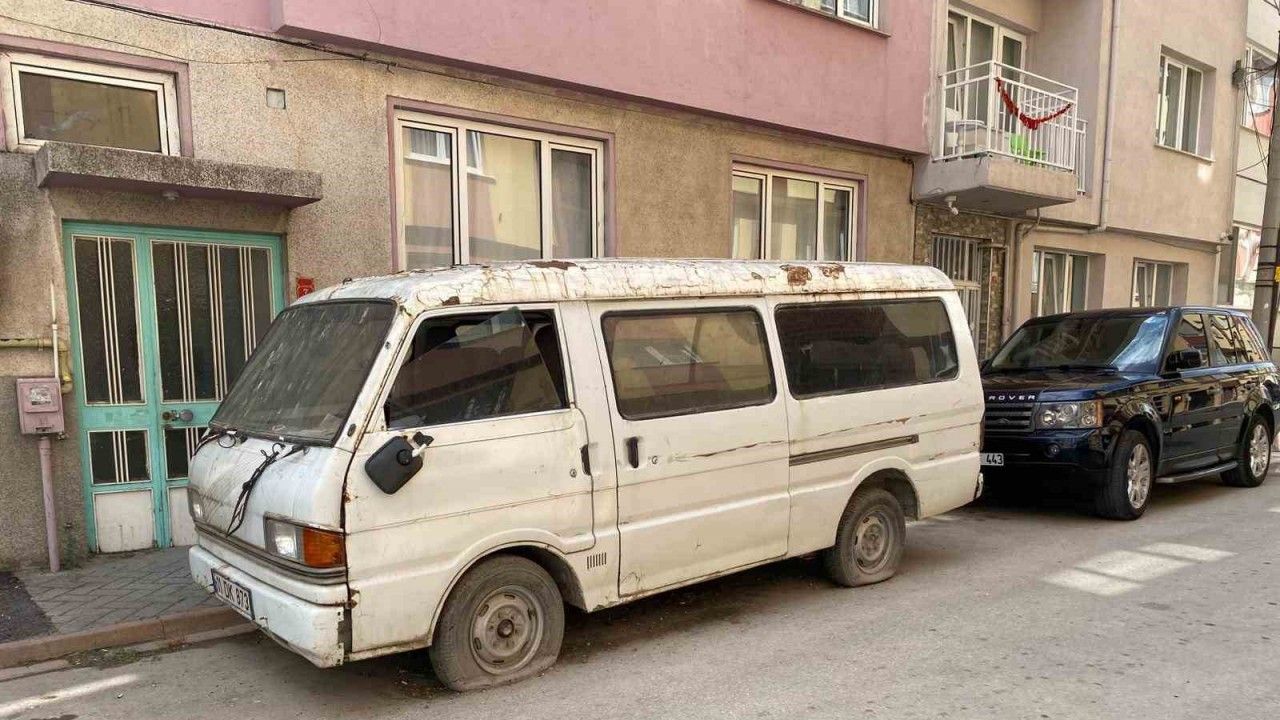 Lastikleri patlamış ve âtıl durumdaki panelvan tarzı araç, sokakta göze hoş olmayan görüntü oluşturuyor.