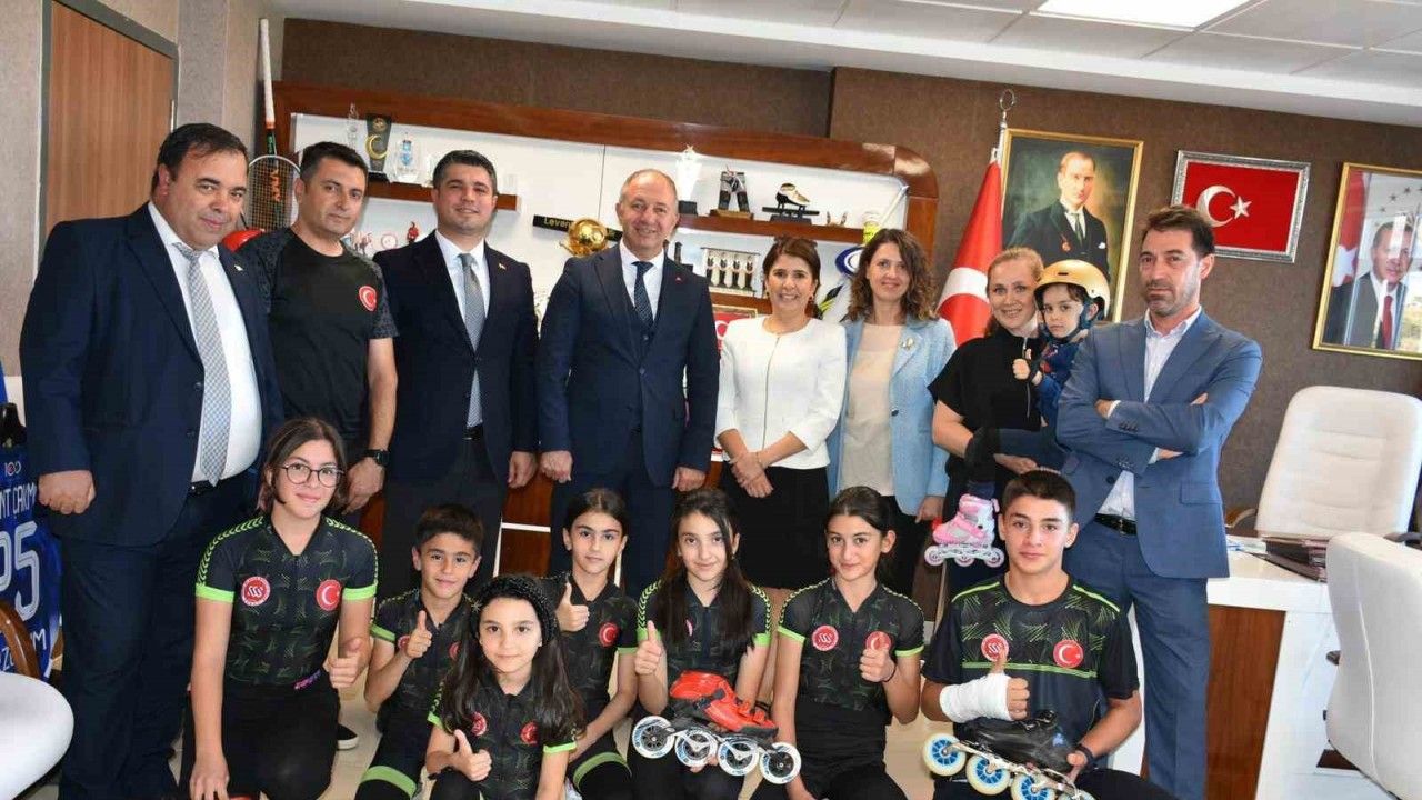 Kulüp Başkanı Buket Aydın, ziyaret anısına İl Müdürü Levent Çakmur’a Speed Skating Spor Kulübünün formasını hediye ederek takımın maçlarına davet etti.