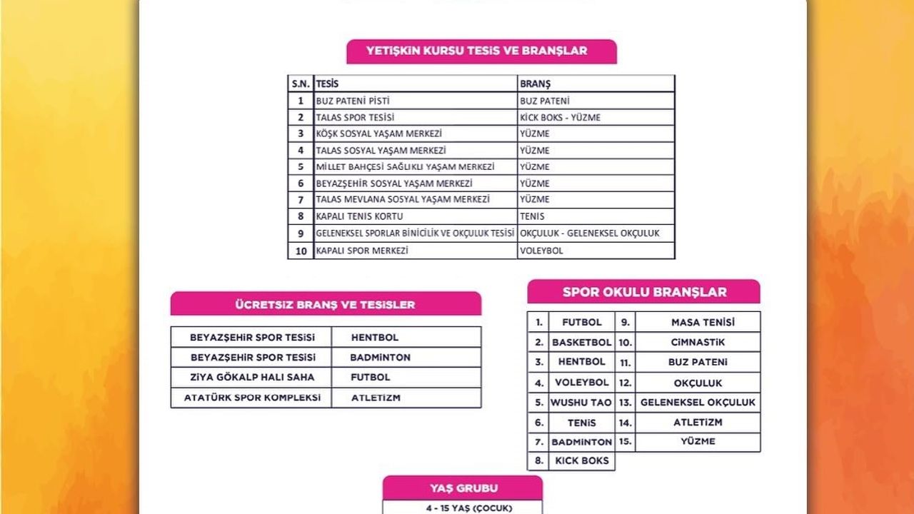 Güz Dönemi Spor Okulları’nda kurslar yaş gruplarına göre planlanırken, kurslarda cimnastik 4-10 yaş, yüzme 6-15 yaş, futbol 6-14 yaş, basketbol, kick boks, voleybol, badminton, atletizm, okçuluk, geleneksel okçuluk, hentbol ve tenis 7-15 yaş, masa tenisi 5-15 yaş, buz pateni 4-15 yaş, wushu tao 4-12 yaş grubuna yönelik sunulacak. Yetişkin kurslarına ise 16-65 yaş arası bireyler katılabilecek.