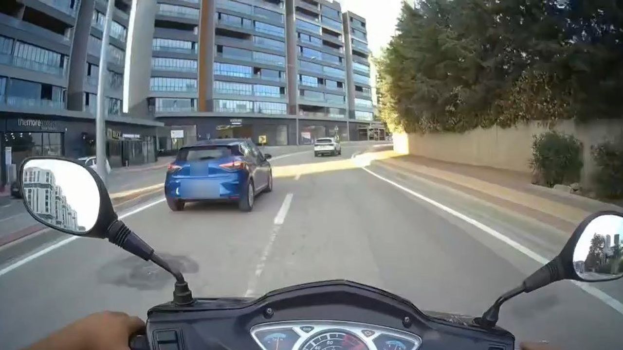 Kask kamerasına yansıyan görüntüler, merkez Nilüfer ilçesi Nilüfer Hatun Caddesinde meydana geldi. Motosiklet sürücüsü, sağ şeritten ilerlerken virajda önüne gelen otomobil sürücüsüne tepki gösterdi. Biraz ileride duran iki şoför, bir birlerine söylendikten sonra yollarına devam etti.