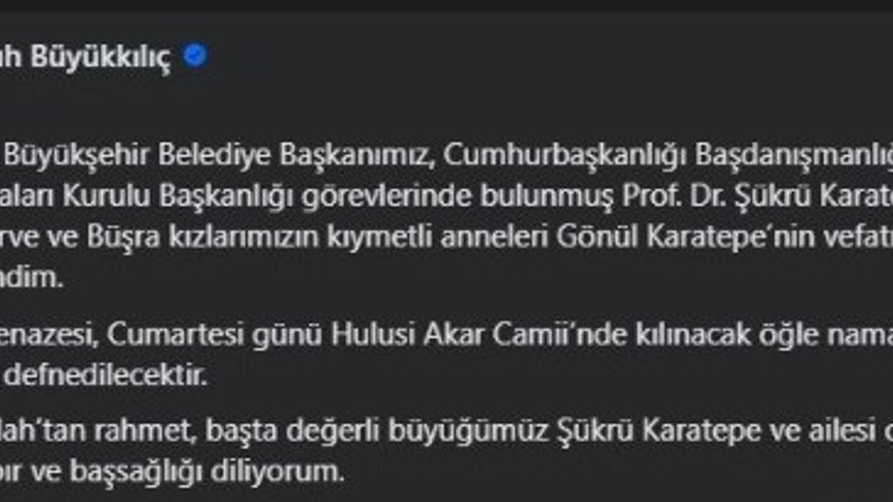 Başsağlığı mesajı yayımlayan Kayseri Büyükşehir Belediye Başkanı Memduh Büyükkılıç; "Önceki Kayseri Büyükşehir Belediye Başkanımız, Cumhurbaşkanlığı Başdanışmanlığı ve Yerel Yönetim Politikaları Kurulu Başkanlığı görevlerinde bulunmuş Prof. Dr. Şükrü Karatepe’nin değerli eşi, Şeyma, Merve ve Büşra kızlarımızın kıymetli anneleri Gönül Karatepe’nin vefatını büyük bir teessürle öğrendim. Merhumenin cenazesi, Cumartesi günü Hulusi Akar Camii’nde kılınacak öğle namazına müteakip Asri mezarlıkta defnedilecektir. Merhumeye Allah’tan rahmet, başta değerli büyüğümüz Şükrü Karatepe ve ailesi olmak üzere sevenlerine sabır ve başsağlığı diliyorum" ifadelerini kullandı.